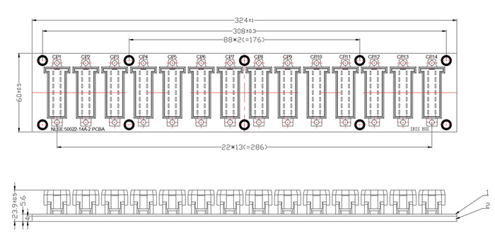 電路板上固定14 個板端連接器,內(nèi)部電路將實現(xiàn)14 連接器的PIN1 實現(xiàn)導(dǎo)通;PIN2 實現(xiàn)